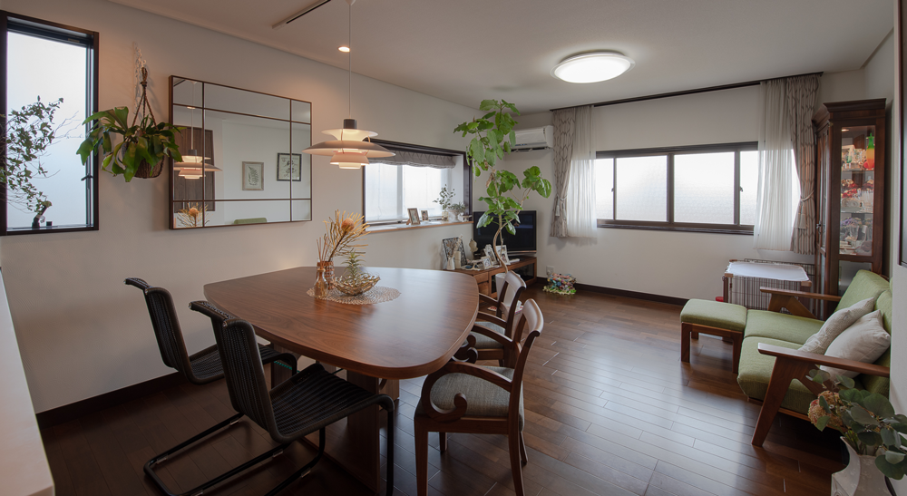 ご新築のときから使用していたキッチンからの水もれが原因で、キッチンを新しく入れ替えることを考え、対面式キッチンへの変更をご希望。この機会にリビングダイニング全体のリフォームを検討しました。
