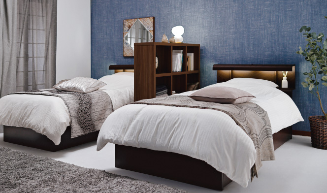 夫婦の寝室、実は半数以上の方が別室にしたいというアンケートの結果があります。音や室温の問題だけでなく、就寝時間のすれ違いやお子様との添い寝など要因はいろいろ。一日の三分の一を占める睡眠時間、プライベートな時間だからこそストレスを軽減したいと思いますよね。とはいえ別室って現実には難しいこと。例えばこんな風にシェルフをおいてみたら…?お互いの気配は感じつつ、就寝前のひと時の自分時間を自分スタイルで過ごせます。