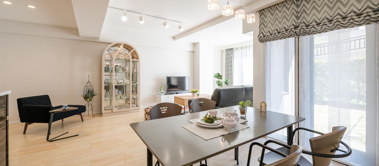専用庭からの日差しが室内にたっぷり差し込み、ご希望されていた明るめの床材に良く映えます。お手持ちのキュリオケースのフレームともコーディネートされ洗練された空間となりました。