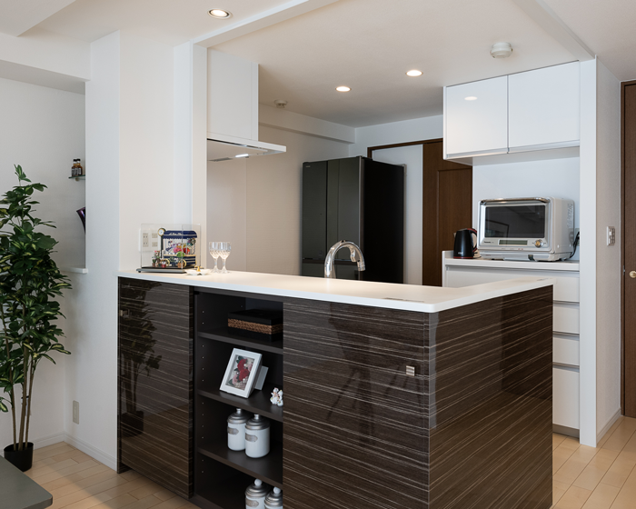 ピアノルーム新設のため、和室を撤去してリビングルームの一部をウォークインクローゼットに。キッチンの壁を撤去してオープンキッチンへ、カウンター下部に収納を設置して飾り棚としても活用できるように要望いただきました。