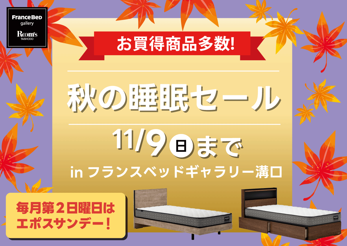 家具のトップメーカー「フランスベッド」のギャラリー・「フランスベッドギャラリー溝口」では、11月9日(日)までの期間「秋の睡眠セール」を開催いたします! お買得なベッドから話題の抗菌マットレス、電動リクライニングベッドなどの人気商品が、期間限定でお買い得!横浜、川崎エリアは勿論、都内からもアクセス便利なギャラリーです。さらにスペシャルクーポンで一層お求めやすくなっております!ぜひ、お気軽にお越しください。